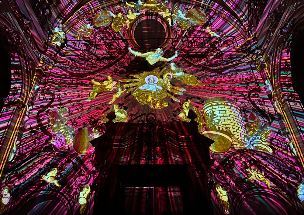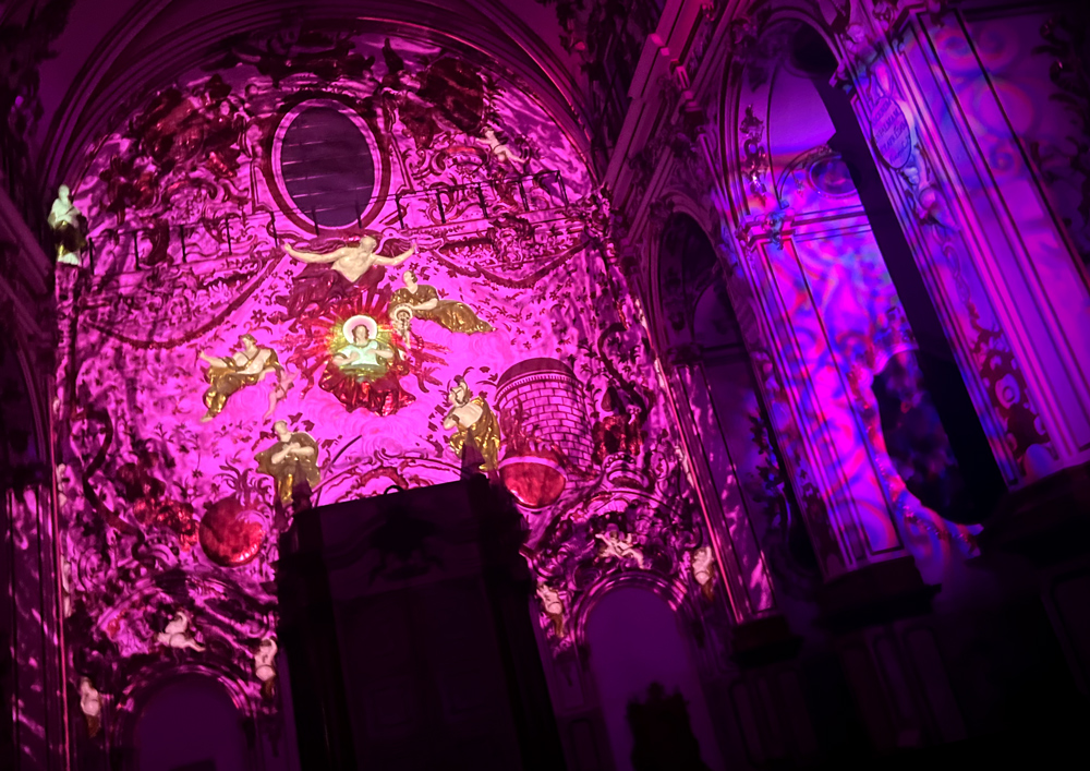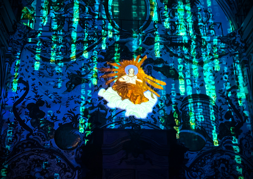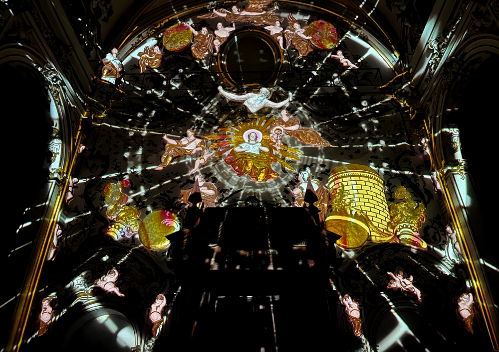 El espectacular relieve —una compleja composición escultórica vertical cargada de mística y simbolismo— se convierte en un lienzo vivo gracias a una cuidada proyección de efectos lumínicos obtenidos a partir de luz escenográfica evolutiva, inteligencia artificial y videomapping, sincronizados con las notas y compases de grandes obras maestras de la música barroca. Cada fragmento musical acompaña y revela, de forma poética y sensorial, los distintos elementos iconográficos del conjunto, sobre un concepto contemporáneo del continuum barroco.